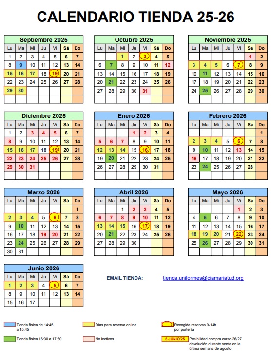 Para la compra de forma ordinaria, la tienda física estará abierta los días marcados en verde de 16:30 a 17:30.